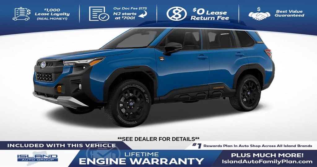 Geyser Blue 2026 Subaru Forester Wilderness AWD Lineartronic CVT 2.5L 4-Cylinder DOHC 16V 4-Wheel Disc Brakes, 6 Speakers, ABS brakes, Air Conditioning, Alloy wheels, AM/FM radio: SiriusXM with 360L, Anti-whiplash front head restraints, Auto High-beam Headlights, Auto-Dimming Mirror with Compass and HomeLink, Automatic temperature control, Brake assist, Bumpers: body-color, Door Edge Guards - Wilderness - Geyser Blue, Driver door bin, Driver vanity mirror, Dual front impact airbags, Dual front side impact airbags, Electronic Stability Control, Emergency communication system: MySubaru Companion (5-years free), Exterior Parking Camera Rear, Four wheel independent suspension, Front anti-roll bar, Front Bucket Seats, Front Center Armrest, Front dual zone A/C, Front fog lights, Front reading lights, Fully automatic headlights, Harman/Kardon Speaker System and Power Rear Gate, Heated door mirrors, Heated Front Bucket Seats, Heated front seats, Illuminated entry, Knee airbag, Low tire pressure warning, Occupant sensing airbag, Outside temperature display, Overhead airbag, Overhead console, Panic alarm, Passenger door bin, Passenger vanity mirror, Power door mirrors, Power driver seat, Power moonroof: Panoramic, Power Rear Gate, Power steering, Power windows, Radio data system, Radio: Subaru 11.6" Multimedia Navigation System, Radio: Subaru 11.6" Multimedia Plus System, Rain sensing wipers, Rear anti-roll bar, Rear Bumper Cover, Rear seat center armrest, Rear Seatback Protector, Rear window defroster, Rear window wiper, Remote keyless entry, Security system, Speed control, Speed-sensing steering, Splash Guards, Split folding rear seat, Spoiler, Steering wheel mounted audio controls, Tachometer, Telescoping steering wheel, Textured StarTex Upholstery, Tilt steering wheel, Traction control, Trip computer, Turn signal indicator mirrors, Variably intermittent wipers, Wheels: 17" x 7.0 J Matte Black Finish Aluminum-Alloy.